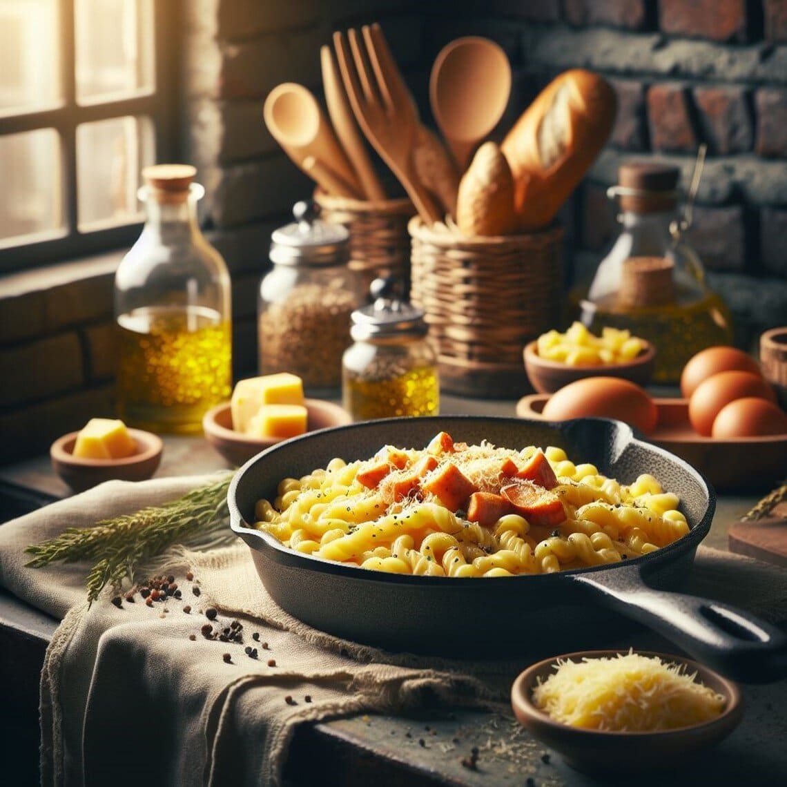 - Nudeln, Wurst und die Hälfte Käse zur Soße geben und unterrühren. Mit Salz und Pfeffer und Paprikapulver würzen. Nudeln in eine ofenfeste Form geben und restlichen Käse darüberstreuen. Im vorgeheizten Backofen 8 bis 10 Minuten überbacken. Käsenudeln aus dem Ofen nehmen.